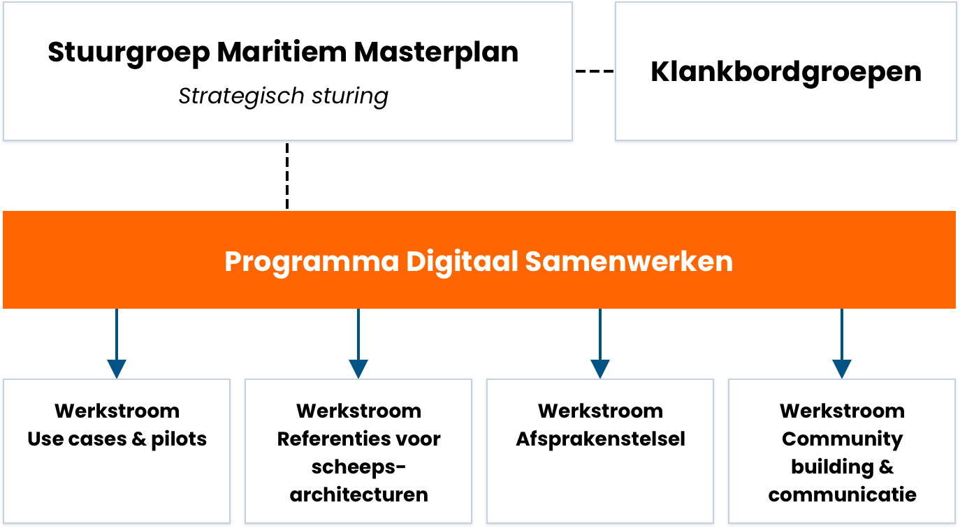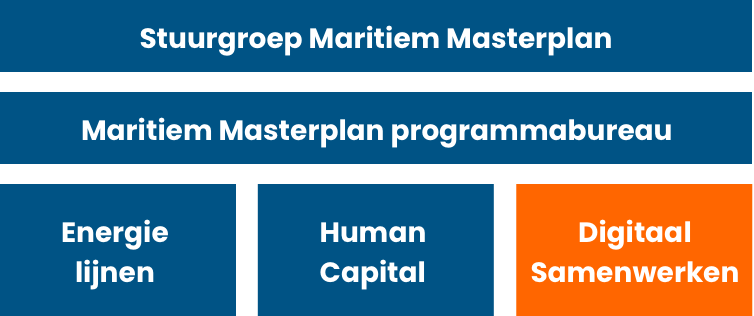De stuurgroep Maritiem Masterplan geeft strategische richting aan het programma Digitaal Samenwerken. De stuurgroep bepaalt de hoofdlijnen, bewaakt de doelen en zorgt dat het programma past binnen het Maritiem Masterplan en het belang van de sector.