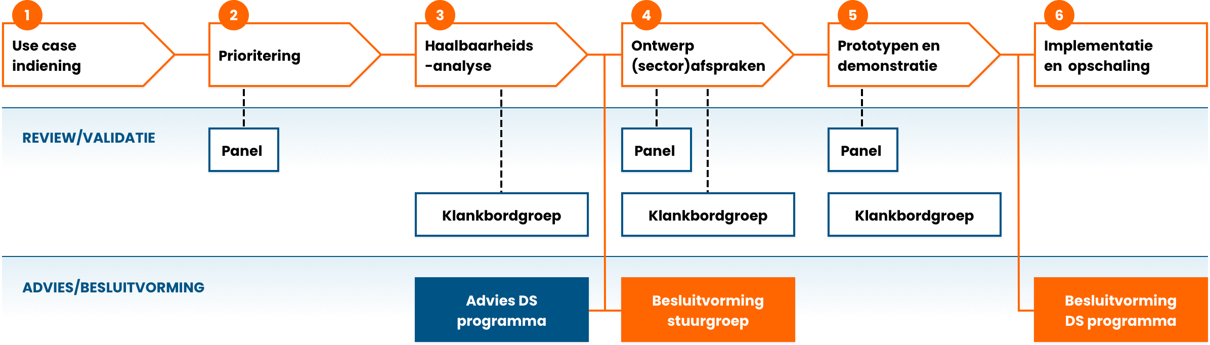 We starten bij de praktijk. Organisaties dienen samen use cases in: concrete situaties waarin digitaal samenwerken beter kan. Een panel uit de sector helpt bij het kiezen van de use cases waar we mee starten.